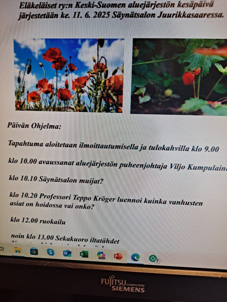 Tapahtuma alkaa tulokahvilla klo 9 ja päättyy klo 15 Keski-Suomen kotiseutulauluun. Professori Teppo Kröger luennoi aiheesta ”Kuinka vanhusten asiat on hoidossa, vai onko?”