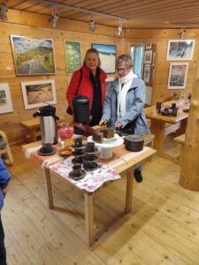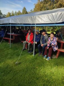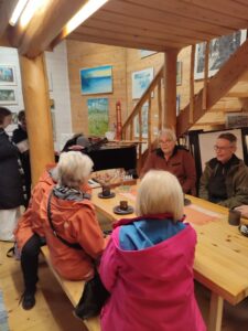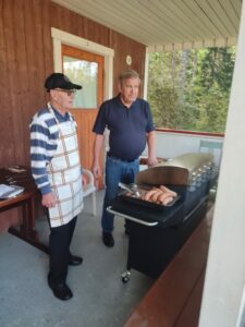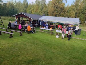 Makkaranpaistoa ulkonuotiolla, mutta voimakkaan tuulen takia kahvit nautittiin Taskisen rannan sisätiloissa iloisen seurustelun merkeissä