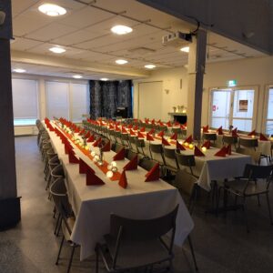Keittiöryhmä mahdollisti maukkaat kevätjuhlat. Oli tarjolla monenlaista herkkua ja ne maistuivat todella hyvin juhlijoille ja sali oli laitettu kauniiksi kukkineen ja valkoisine pöytäliinoineen. Tanssia Segnoset-yhtyeen tahdissa.