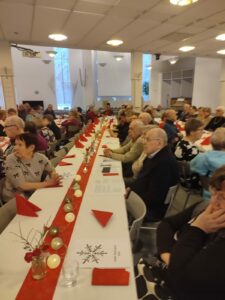 Joulujuhlan tarjoilua. Yleisö viihtyy.